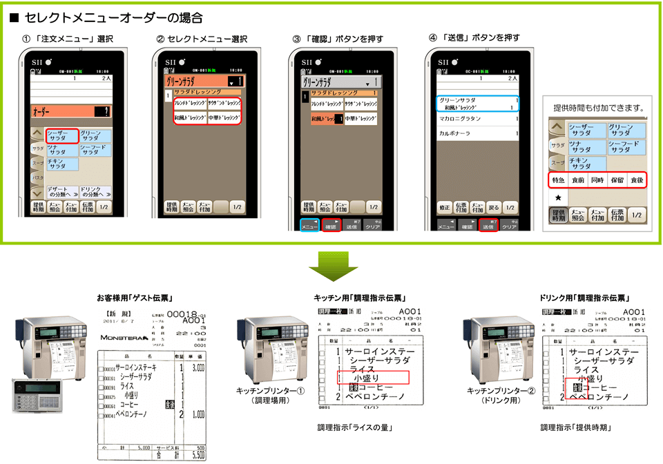 お客様用の「レシート」と、レジと離れた厨房に「注文伝票」として同時に出力します。