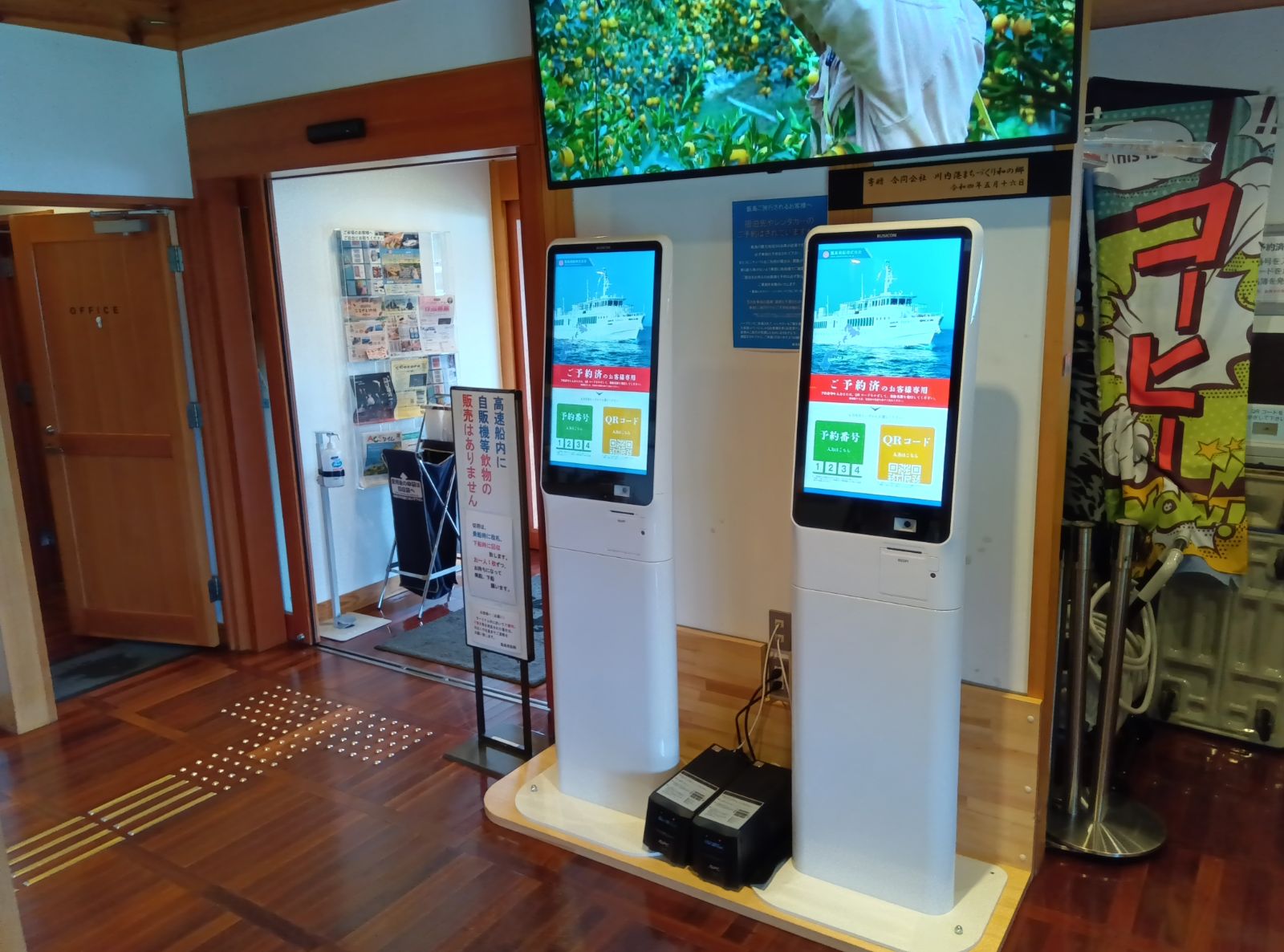 同じ甑島でフェリー・高速船を運航している甑島商船株式会社様にも、乗船受付の発券端末として弊社のキオスク端末「BigTouch」を導入いただいています。