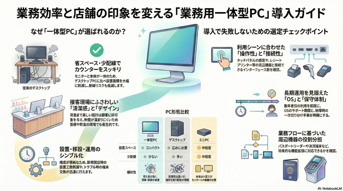 本記事では、一体型PCの基本的な考え方から、デスクトップPCやミニPCとの違い、業務用でのメリット、選び方、導入時の運用ポイントまでを整理して解説します。