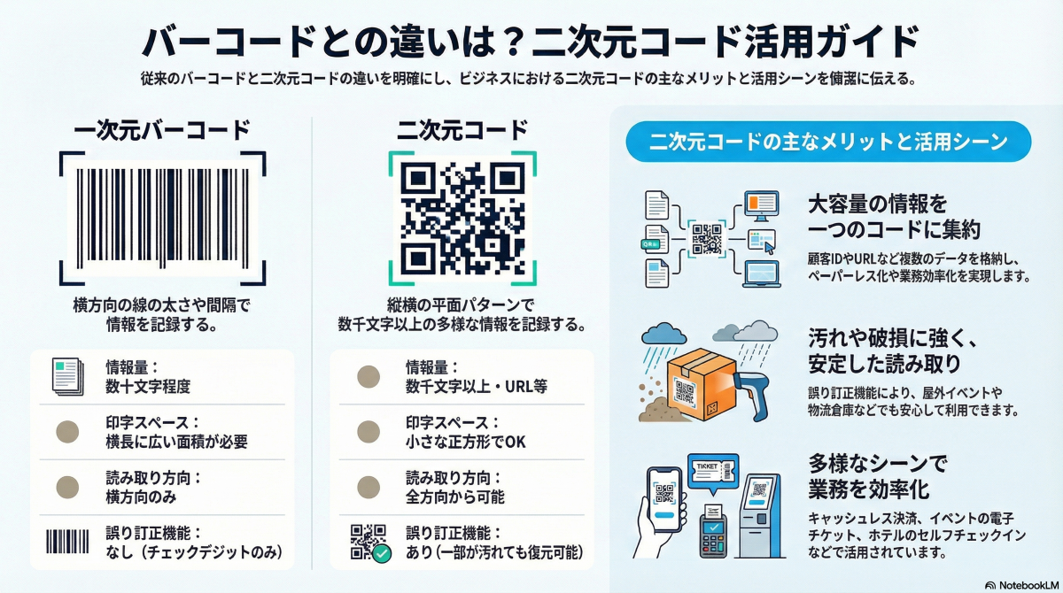 ここでは、二次元コードのメリットを具体的な利用シーンとともに整理し、解説します。