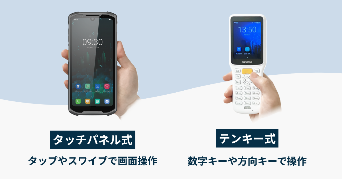 ハンディターミナルの画面操作は、タッチパネル式とテンキー式の2種類が主流です。近年はAndroid OSを搭載したスマートフォン型の端末が増えており、タッチパネルで直感的に操作できる機種が人気を集めています。