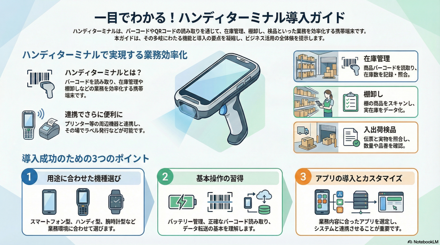 この記事では、ハンディターミナルの基本操作から業務別の活用方法、導入時の機種選びや設定まで、使い方のすべてを徹底解説します。