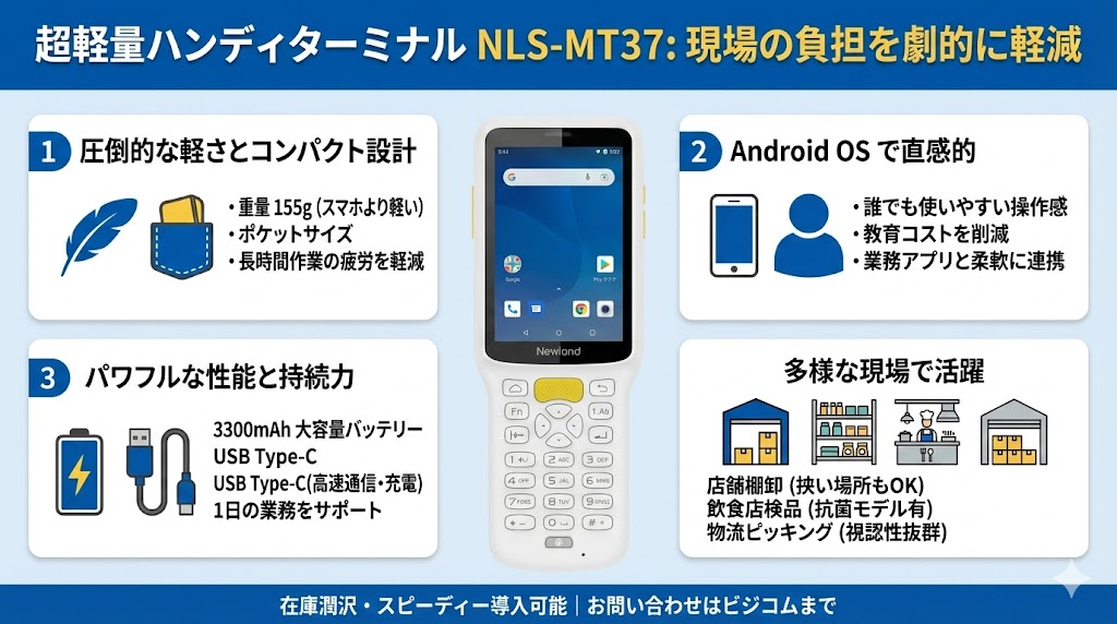 数あるデバイスの中でも、特に注目したいのがNewland AIDC社の「NLS-MT37」です。このモデル、実は現場の「あったらいいな」が凝縮されているんです。