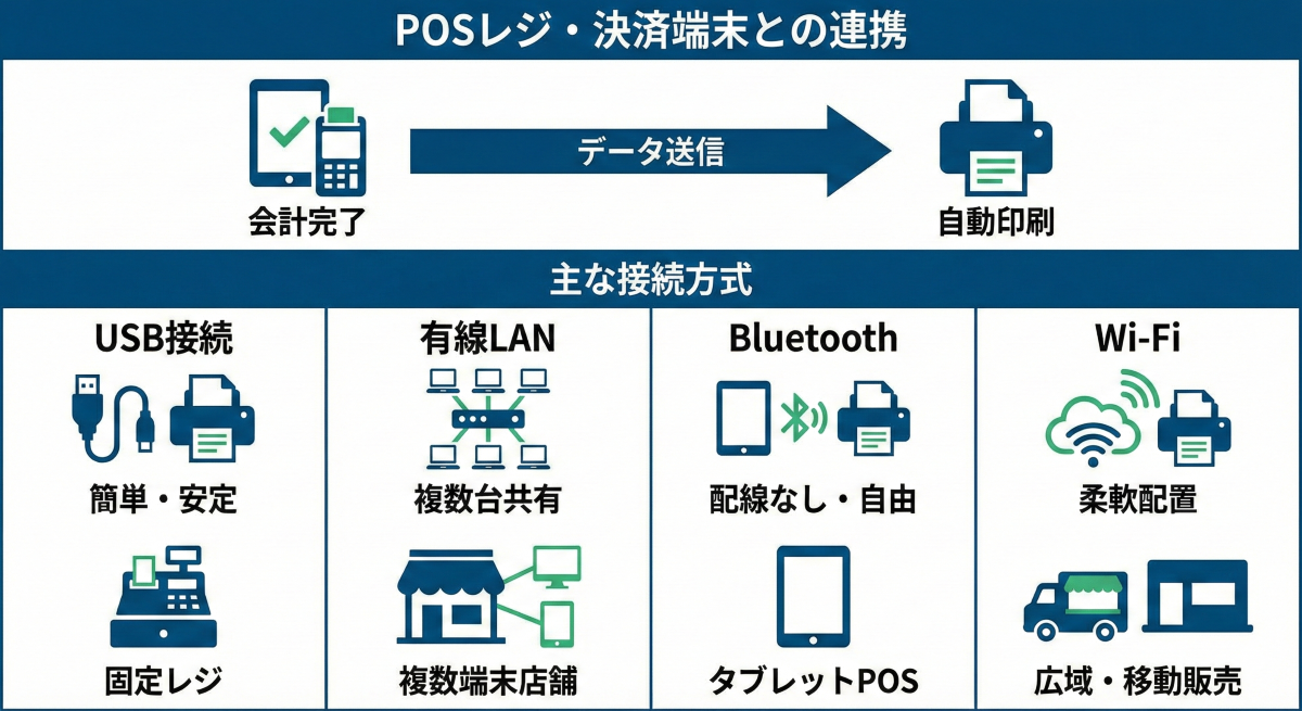 プリンターと端末を接続する方式には複数の選択肢があり、運用環境に合った方式を選ぶことが設定トラブルを減らすポイントになります。