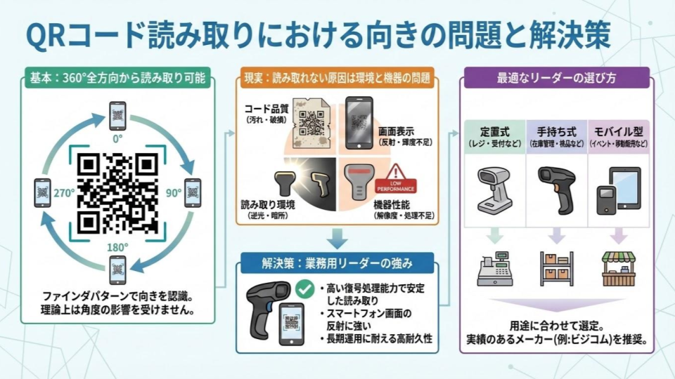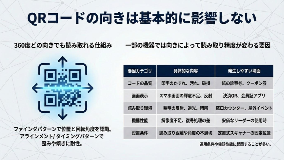 QRコードの仕様上は向きの影響を受けにくいにもかかわらず、現場では「特定の角度だと読み取りにくい」という声が聞かれることがあります。これはQRコードそのものの問題ではなく、運用条件や機器性能に起因するケースがほとんどです。