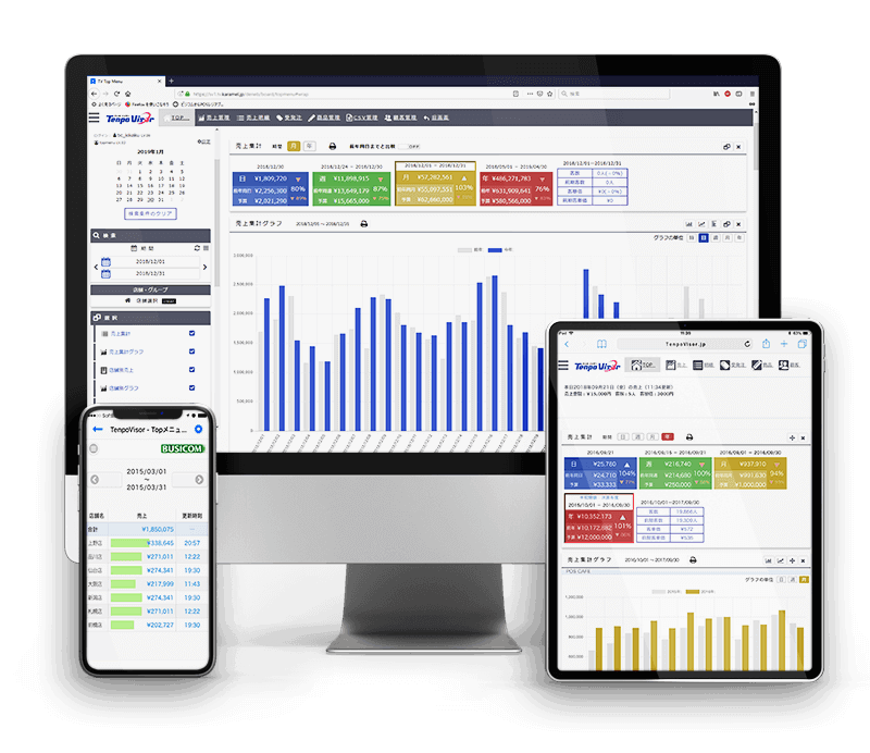 クラウド店舗本部管理システム「TenpoVisor」で、店舗の情報をいつでもどこでも確認可能。マスタや複数店舗の情報も一元化し、顧客分析機能や売上・在庫をクラウドでご確認いただけます。