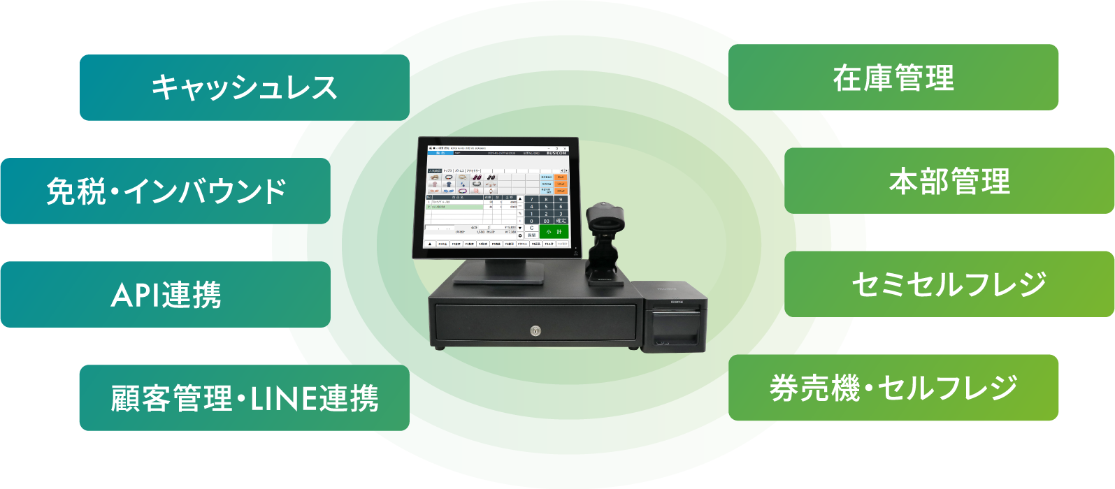 POSシステムとの連動も可能で、対面レジだけではなく、セルフレジや券売機などの連携実績も豊富。