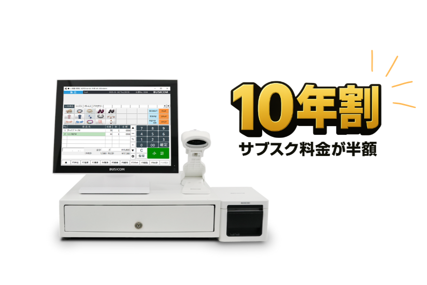 「10年割」とは、ビジコムのPOSレジ「BCPOS」を、10年以上継続してご利用いただいたユーザーに対して月額の利用料金が半額になる制度です!