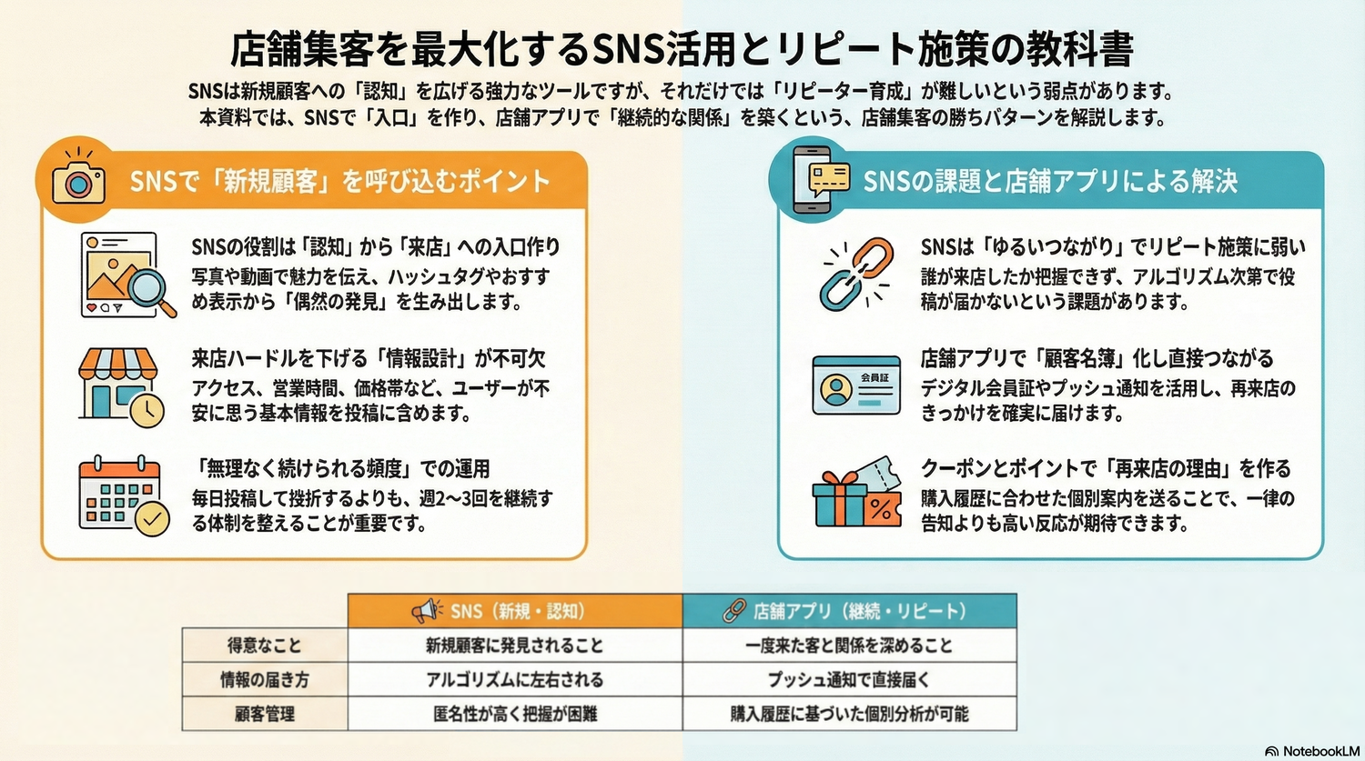 店舗集客においてSNSは、新規顧客との接点を作るうえで有効な手段です。低コストで始められ、反応を見ながら改善できる一方で、SNSだけでは来店後の継続的な関係づくりが難しいという課題もあります。