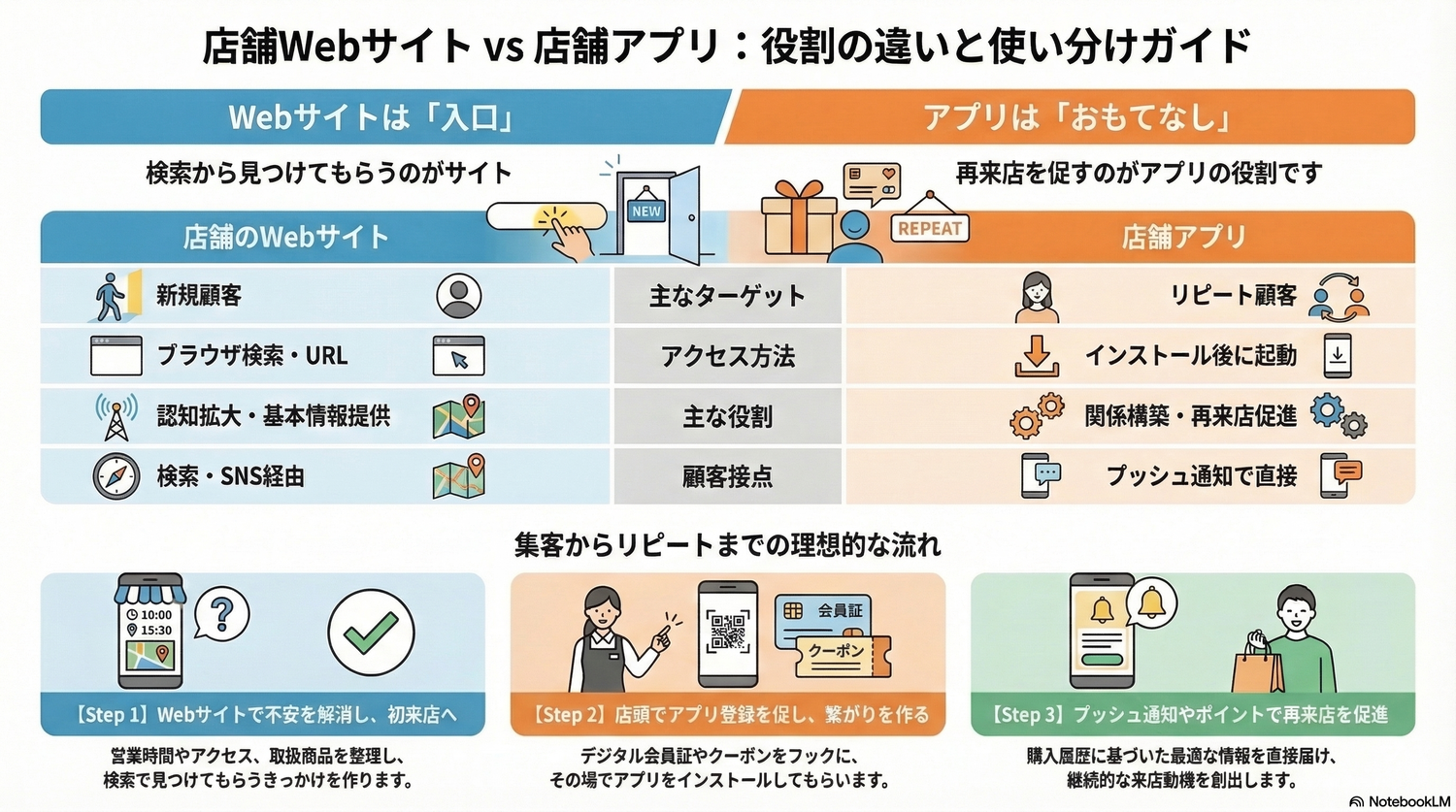 店舗のWebサイトと店舗アプリは、どちらが上という関係ではなく、役割が違うため使い分けるのが基本です。サイトは新規顧客に見つけてもらい、来店前の不安を解消する「入口」を担います。一方でアプリは、来店後のお客様と継続的につながり、再来店を作る「リピート施策」に向いています。