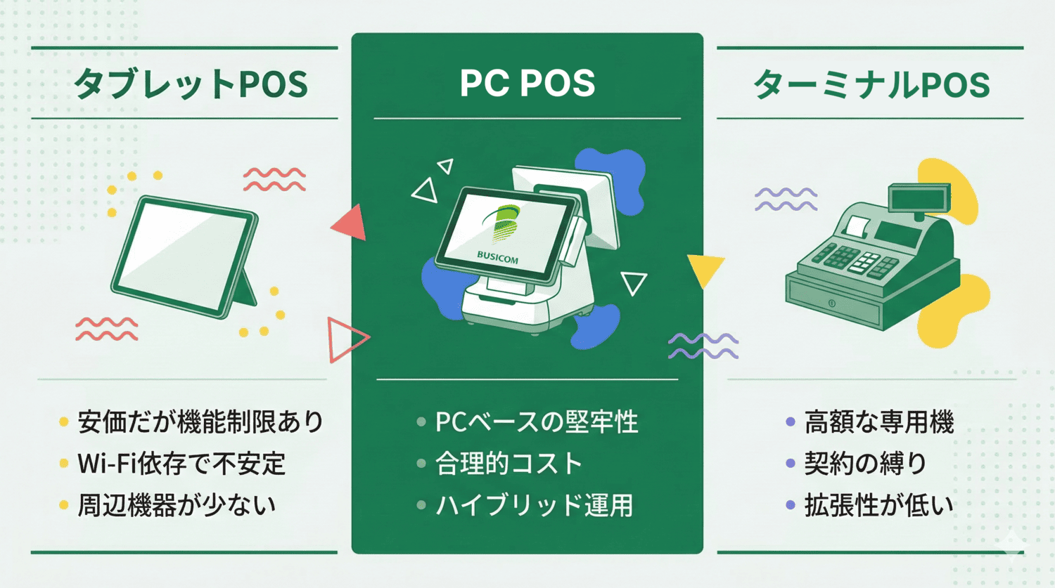 POSレジ選びを「タブレットPOSか、ターミナルPOSか」という二択だけで考える時代ではありません。店舗運営の現実を見ると、その中間にある、より現実的でバランスのよい選択肢が必要です。