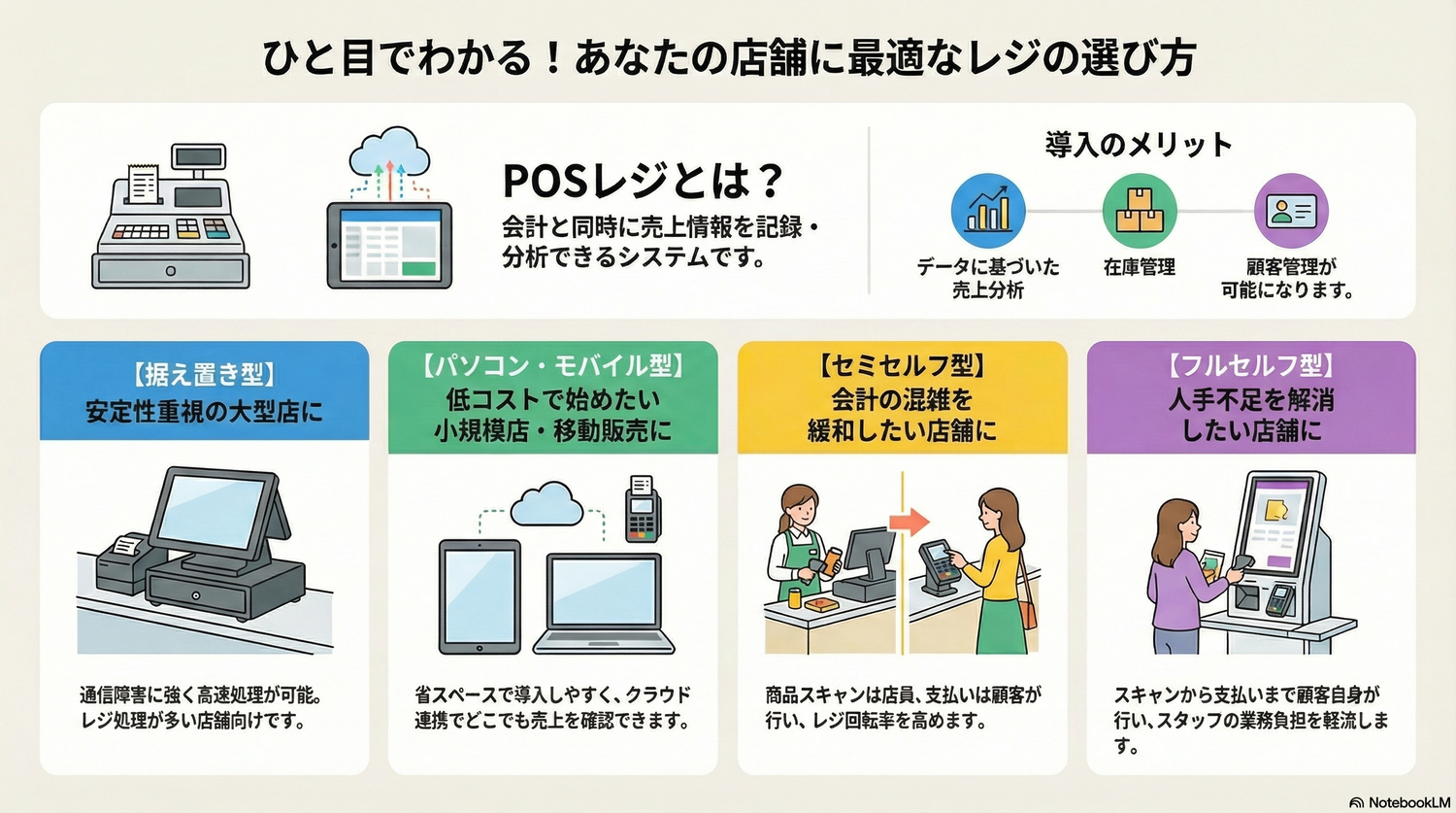 ここでは、代表的なレジの種類ごとの特徴を整理しつつ、導入時にどのような観点で選び分ければよいかを解説します。各タイプのメリットや向いている店舗像を確認しながら、自店に合うレジを見極めましょう。