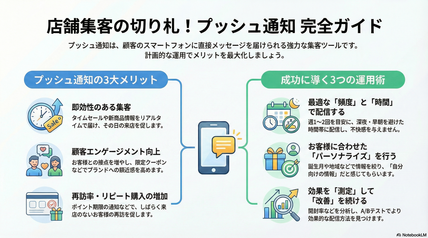 プッシュ通知は、即効性のある集客や顧客エンゲージメントの向上、再訪率アップなど、店舗集客において多くのメリットをもたらします。一方で、配信頻度や内容、タイミングを誤るとお客様に嫌われてしまうリスクもあるため、慎重な運用設計が欠かせません。
