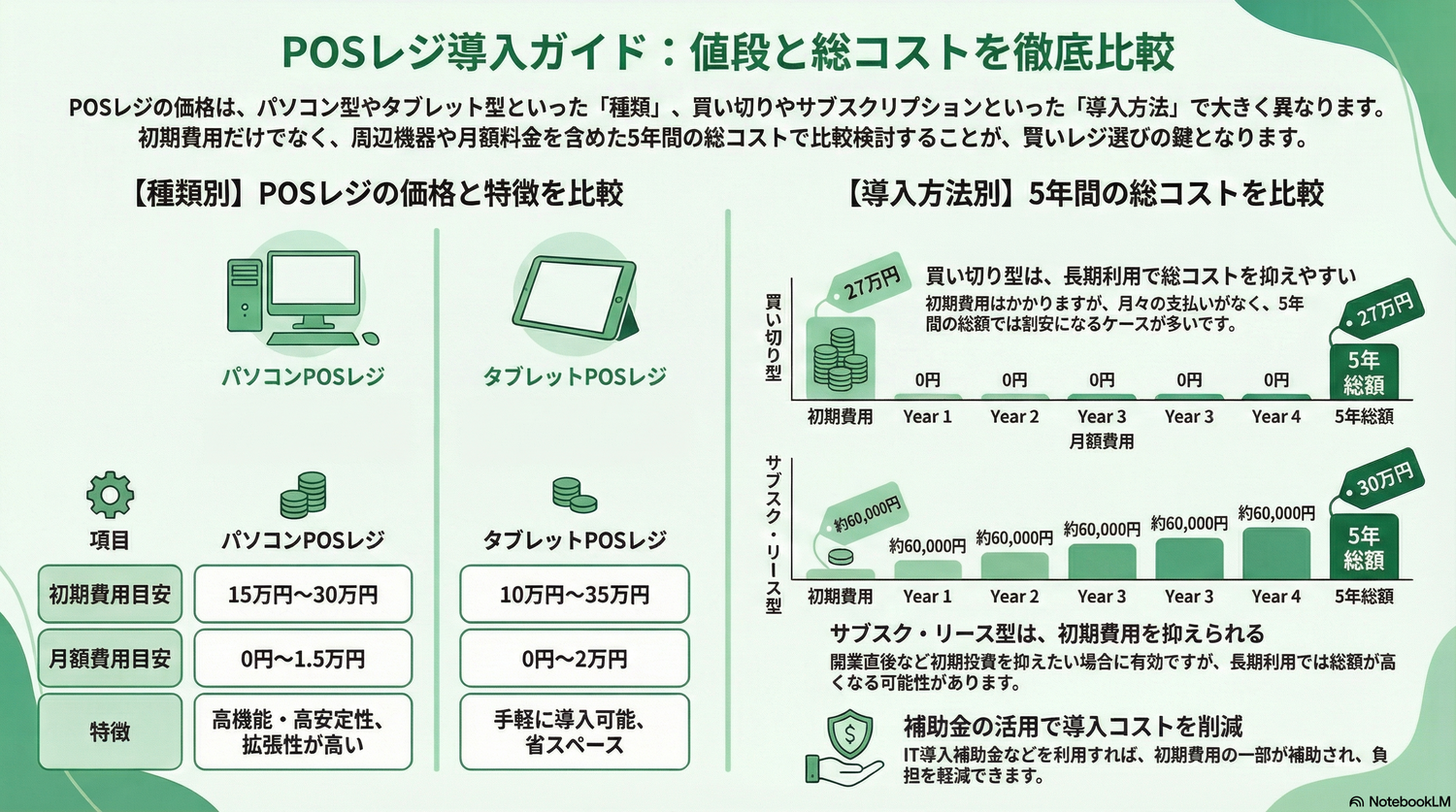 レジの値段は、種類や導入方法、周辺機器、ランニングコストなど、さまざまな要素によって変わります。初期費用だけで比較すると、タブレットPOSが安く見えますが、5年間の総コストで見ると買い切り型やパソコンの方が割安になるケースも多い傾向があります。