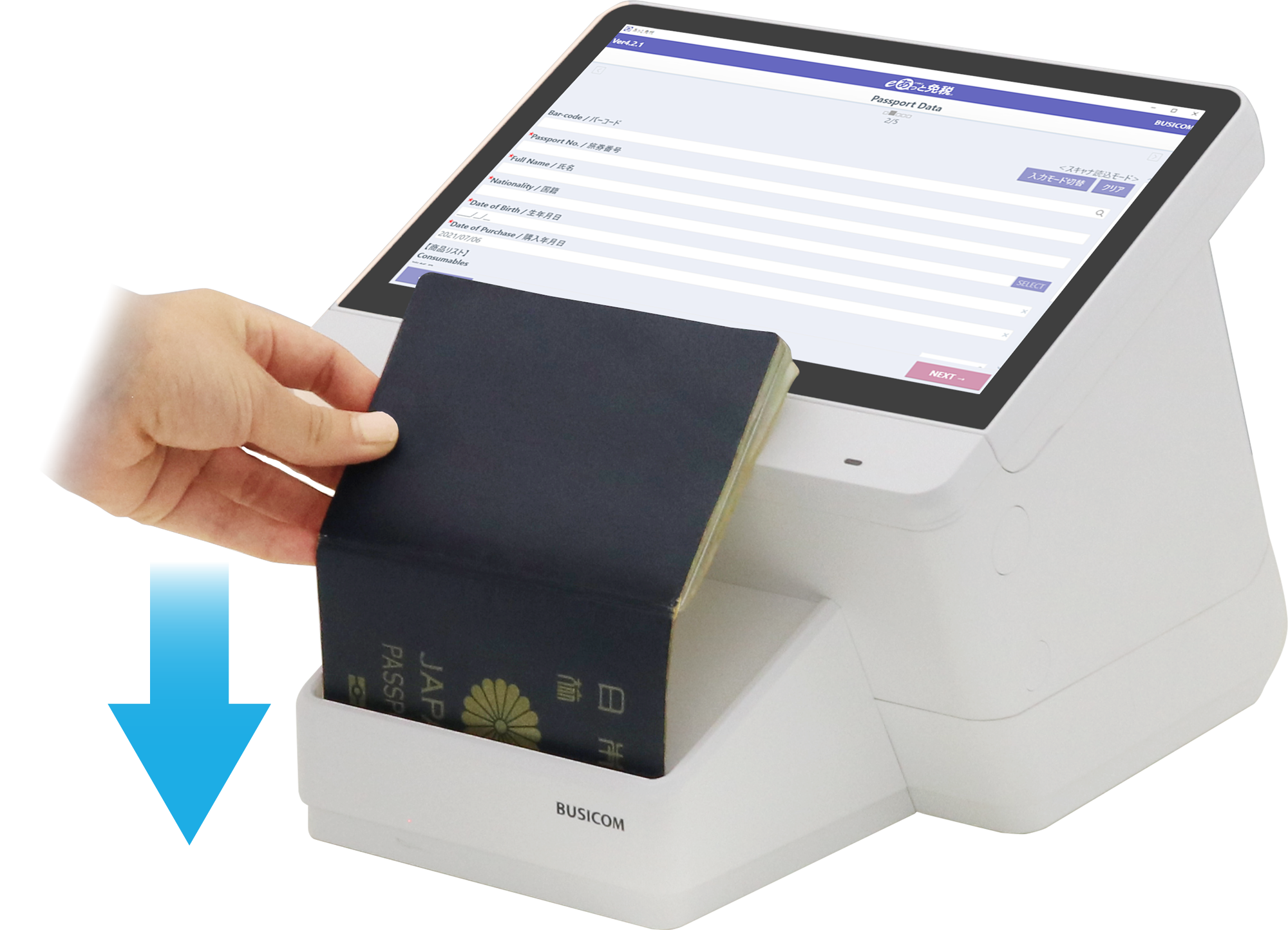 スマートに一体化する専用パスポートリーダーユニットにより、旅券情報をOCRで瞬時に読み取り可能。2026年11月施行の免税制度改正により導入される「リファンド方式」を見据えた設計で、免税システムを開発・提供するベンダー様向けの搭載端末としても最適です。