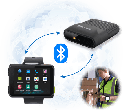二つの製品はBluetooth接続で併せてご使用いただくことができます。 例えば、右手はバーコードをスキャン、左手はスキャンしたデータを手元で確認することができるなど、 作業の大幅な効率化を実現します。