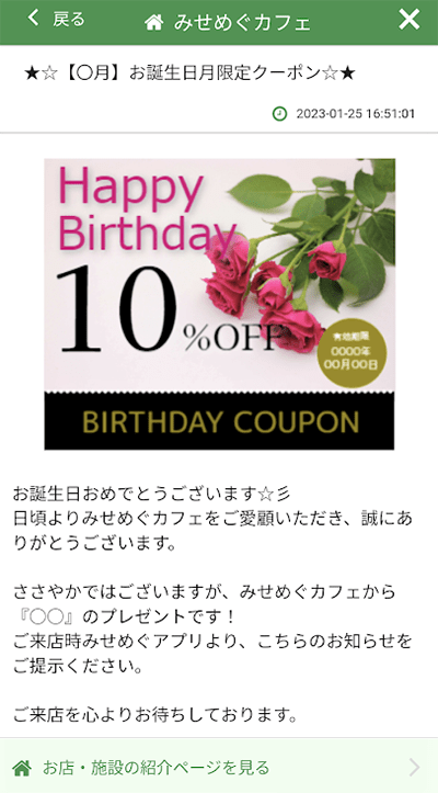 - ・クーポン配信(誕生月クーポンなどのセグメント配信可能)