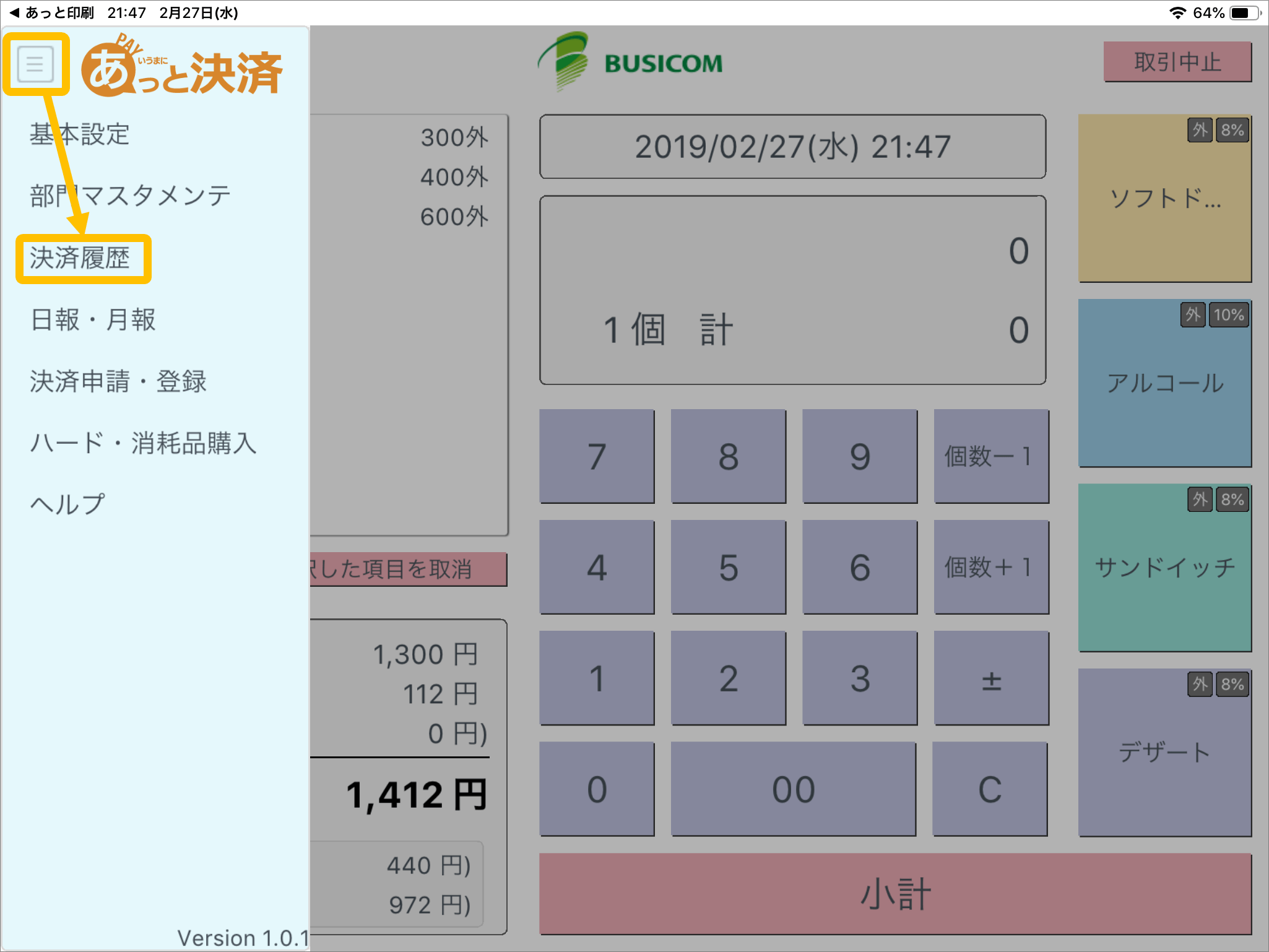 [1]あっと決済の左上のメニューから決済履歴を選択します。