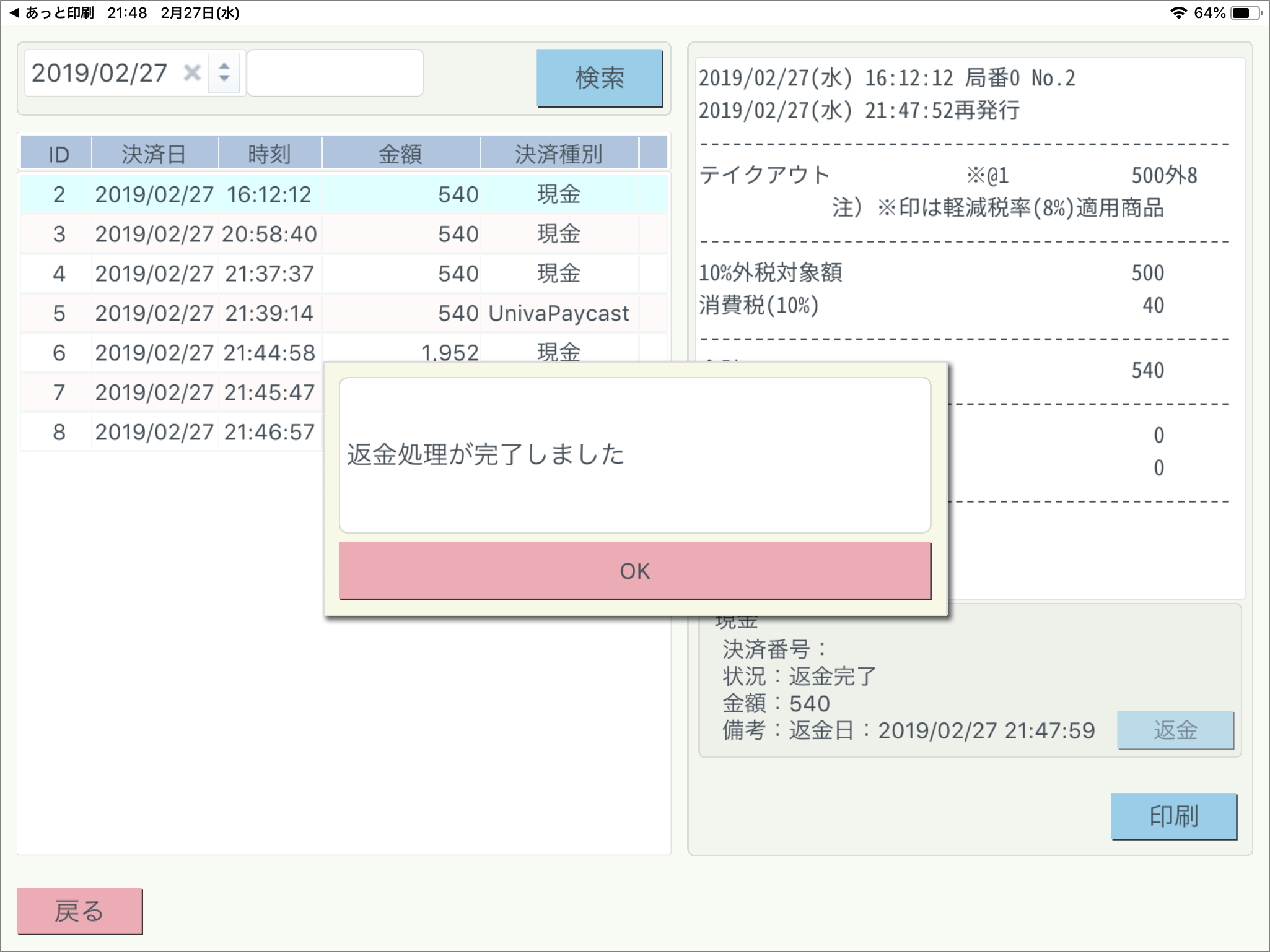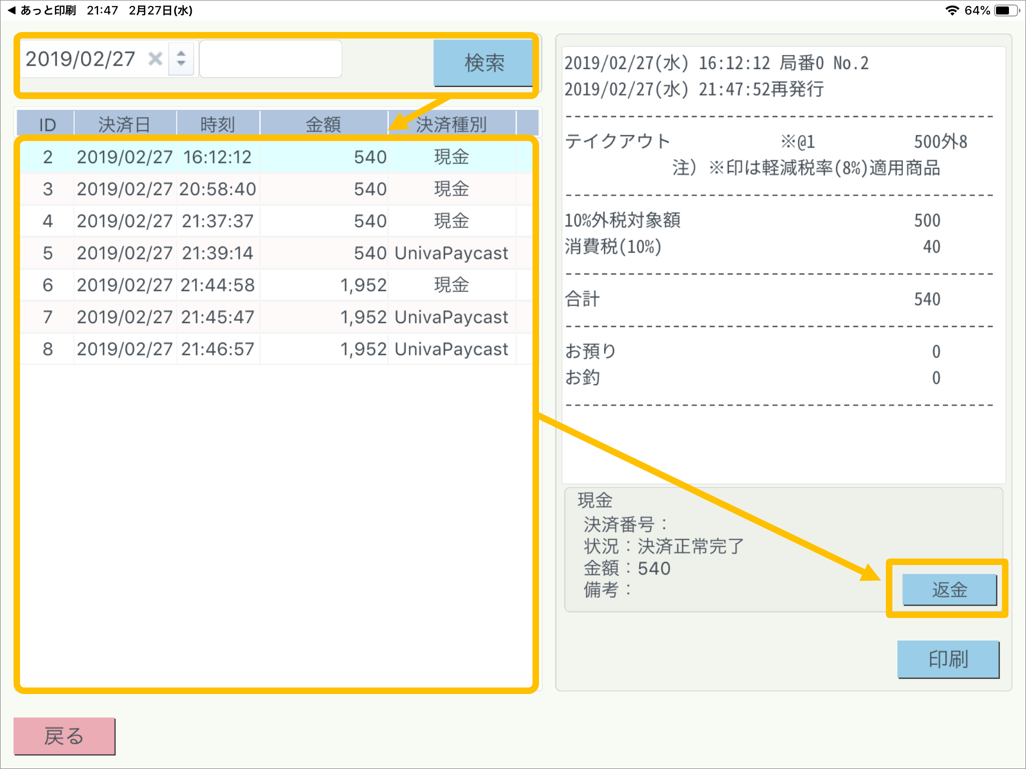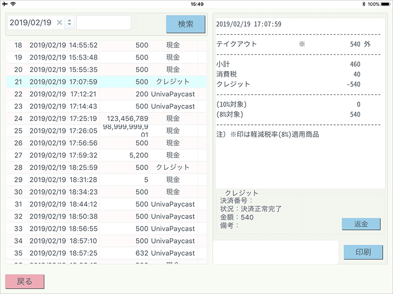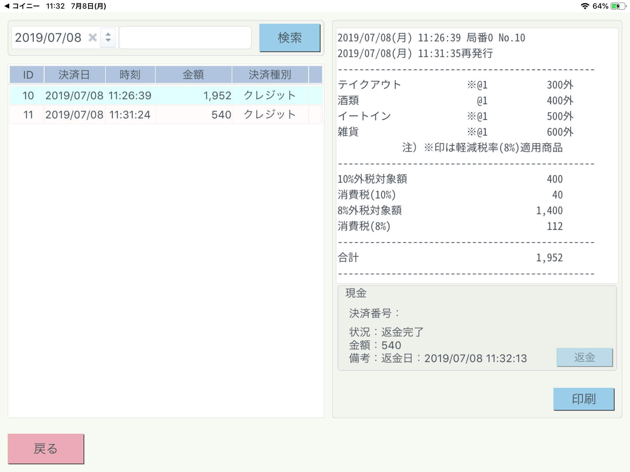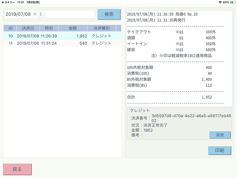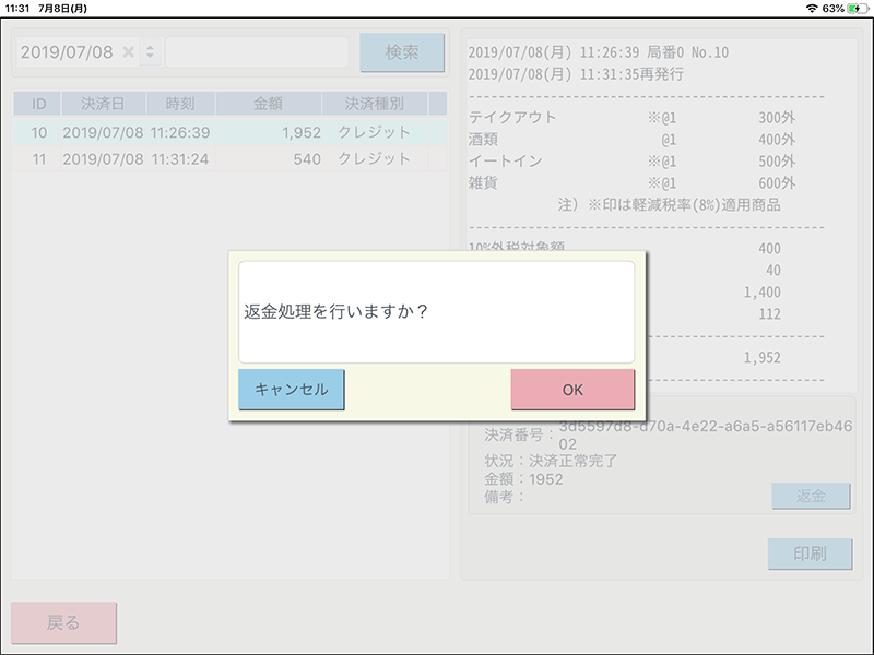 [4] 返金ボタンをタップ、返金処理がされます。 ※印刷ボタンは、レシートの再発行ができます。