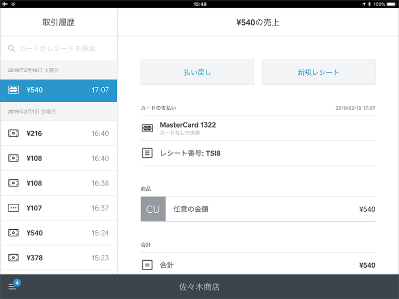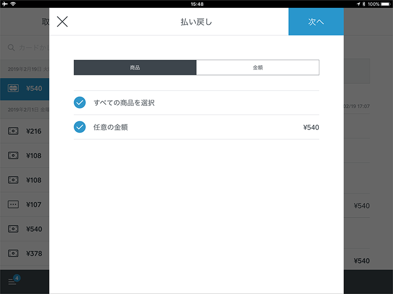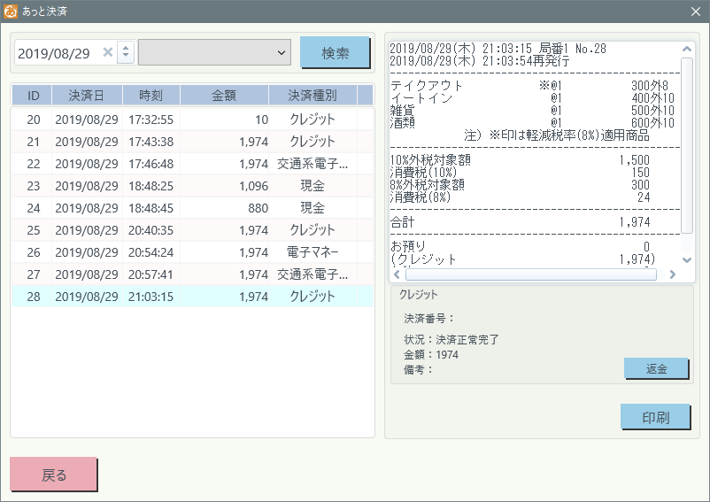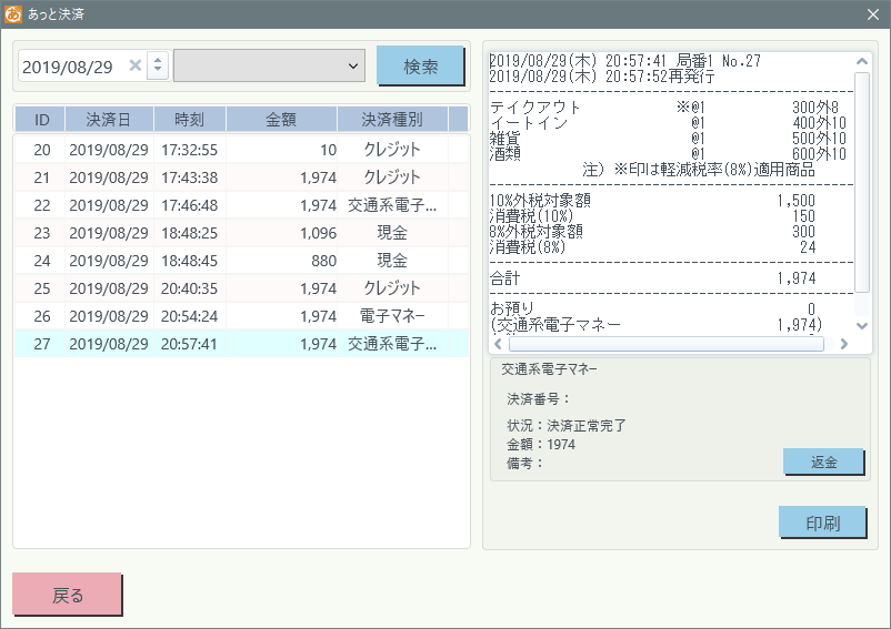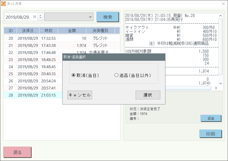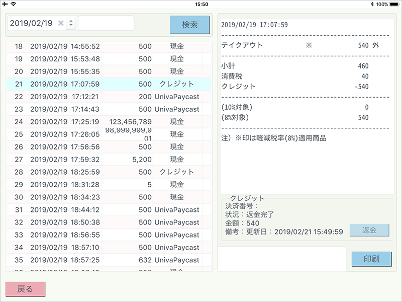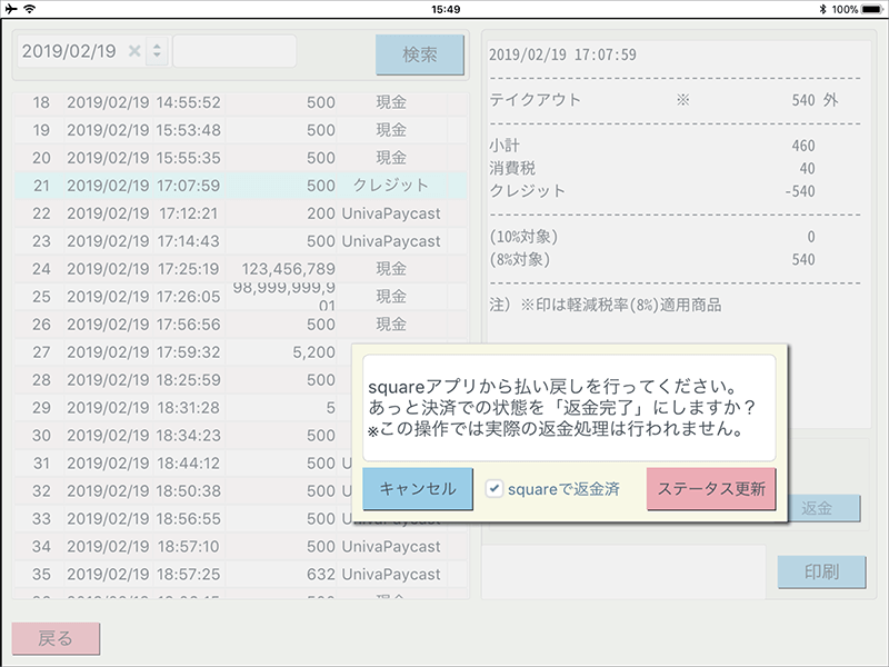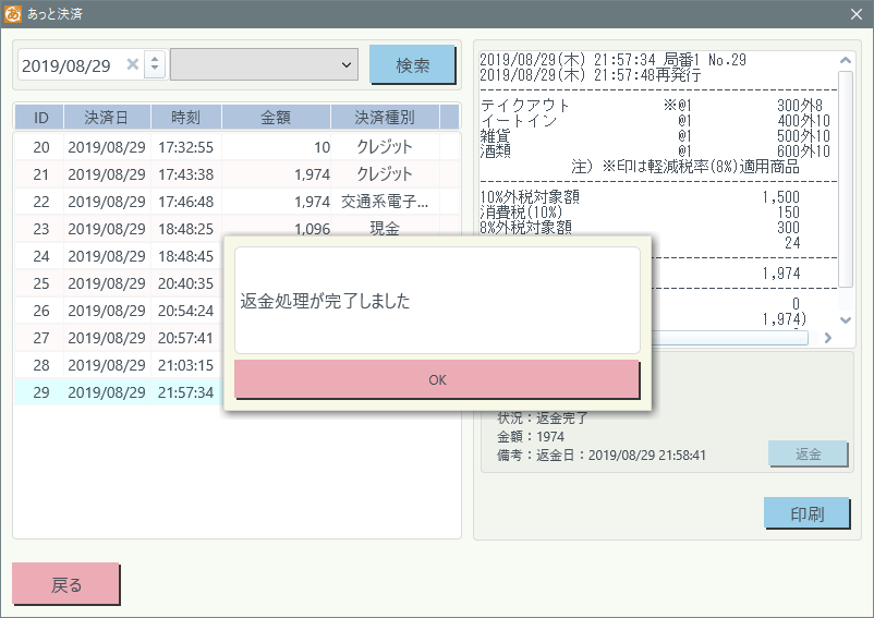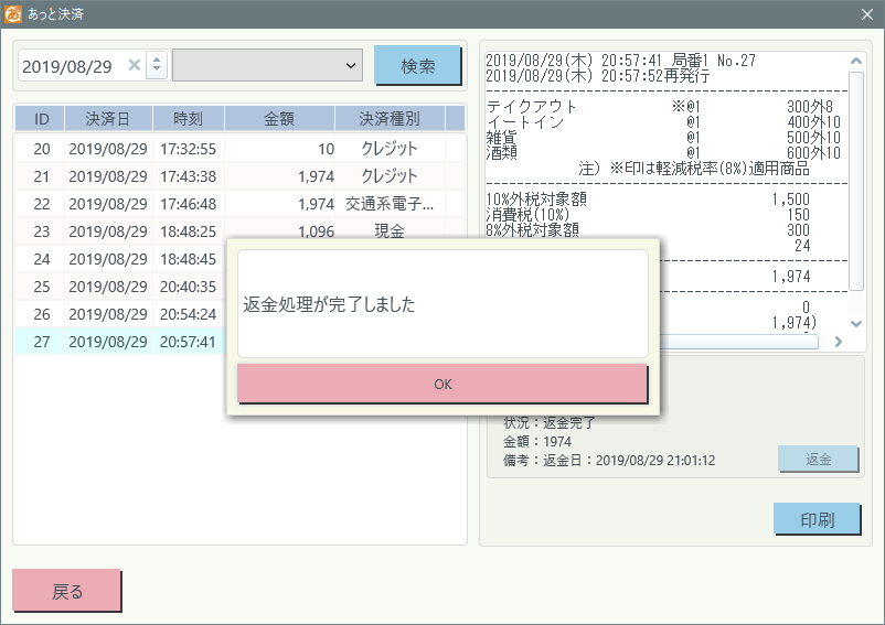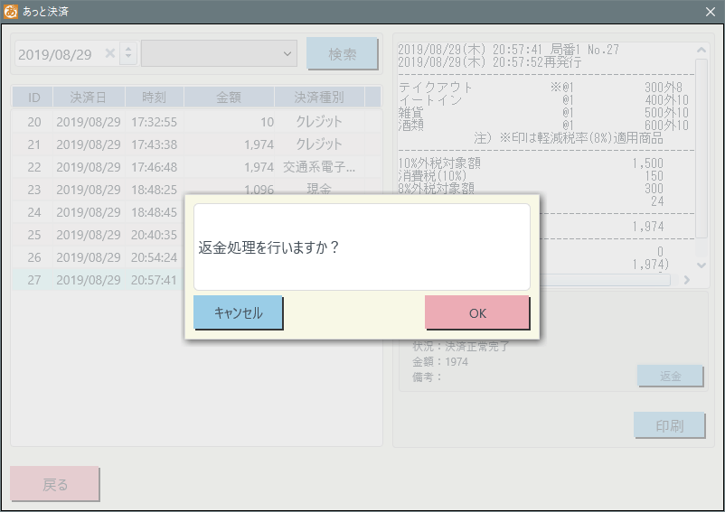 [4] 返金ボタンをタップ、返金処理がされます。 ※印刷ボタンは、レシートの再発行ができます。