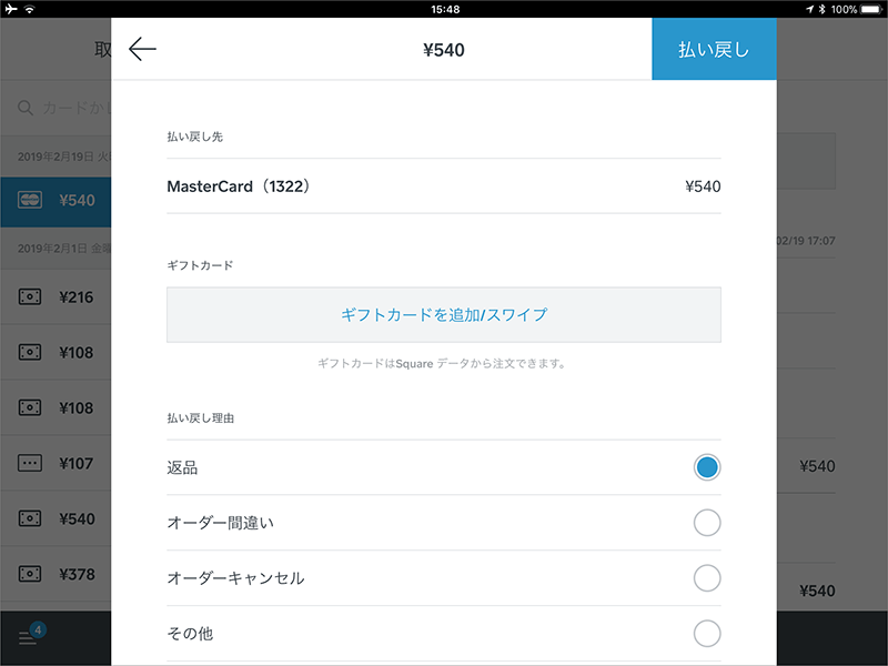 [5] 画面左の取引履歴から、返金を行う伝票を指定してから「払い戻し」ボタンをタップします。