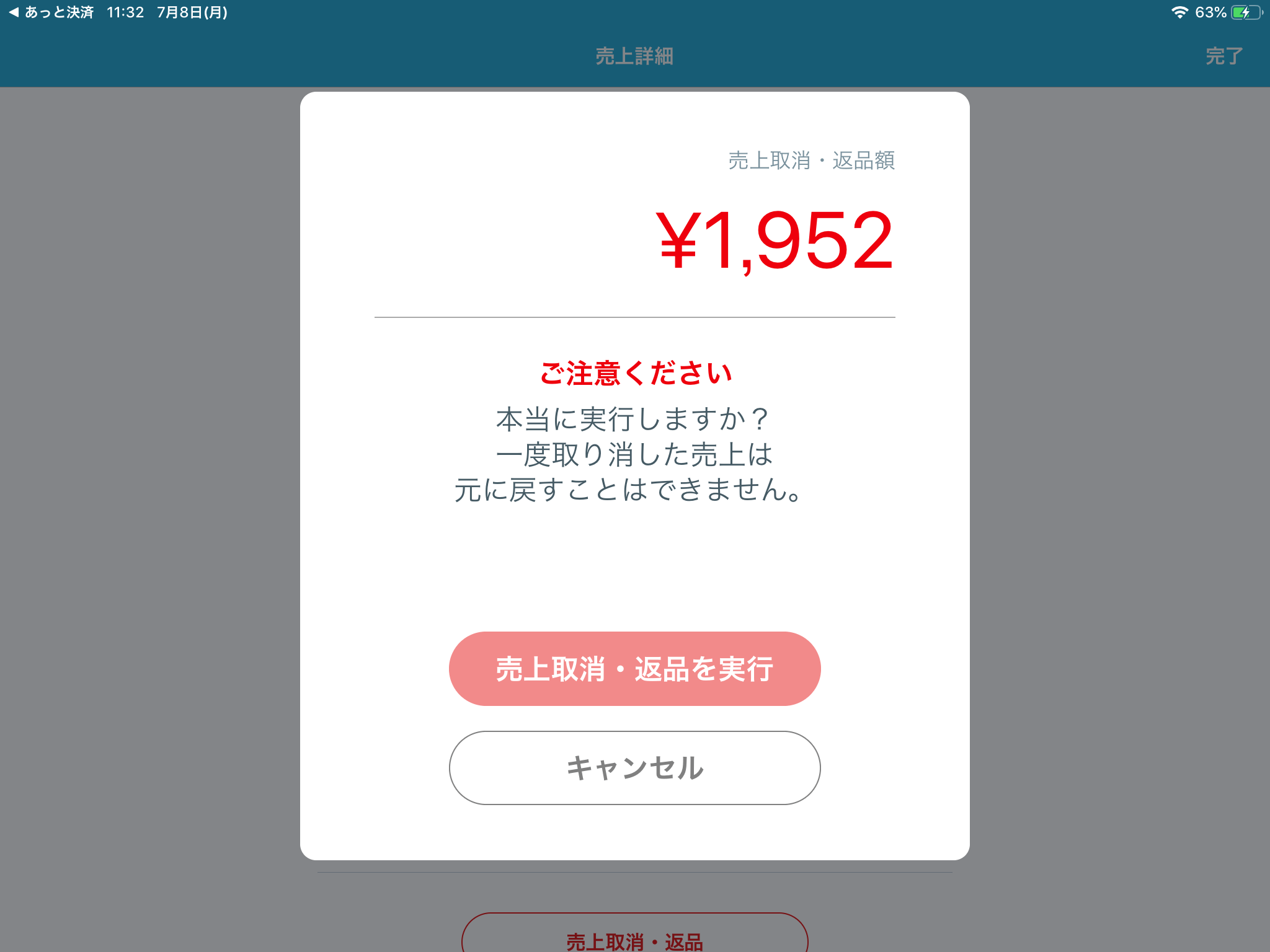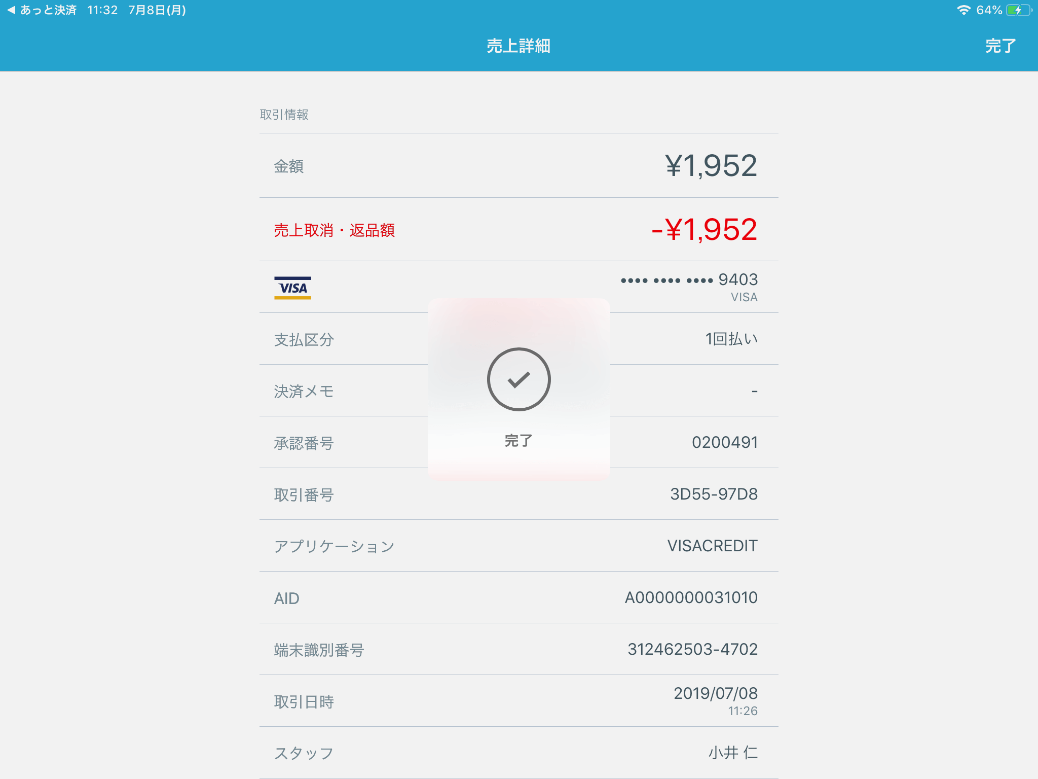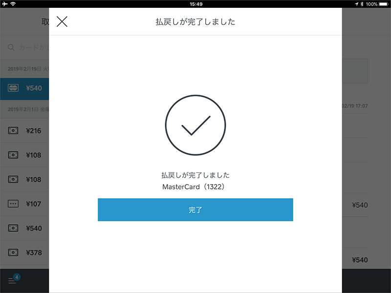[8] 払い戻しが完了されました。「完了」をタップした上で、Squareアプリを閉じ、あっと決済を起動させて下さい。