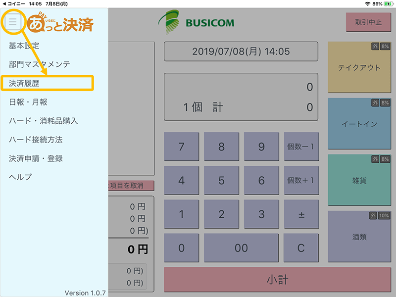 [1]画面左の「三」マークをタップ。 メニューを表示させ、「決済履歴」をタップします。