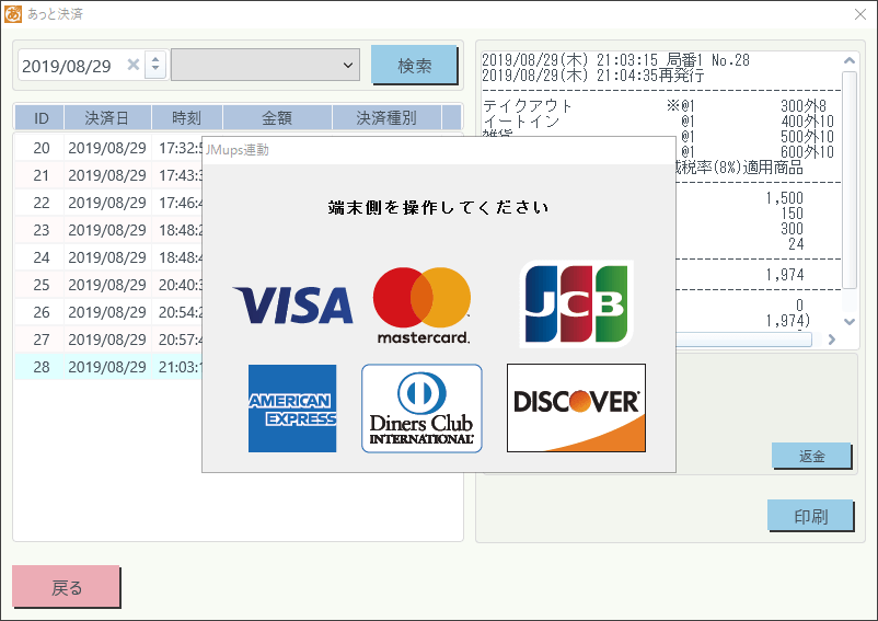 [13] J-Mups 端末よりレシートが発行され、返金処理がされます。 ※あっと決済の印刷ボタンを押すと、レシートの再発行ができます。