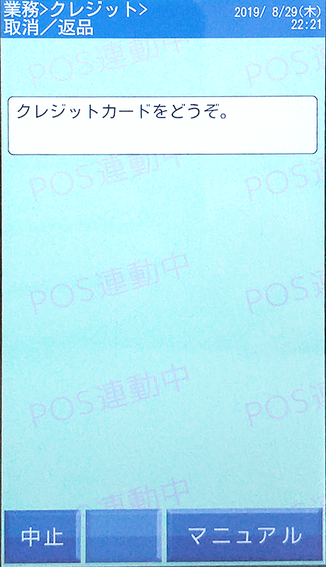 [8]「クレジットカードをどうぞ」 と J-Mupsに表示されま す。 [9]取引したクレジットカードを PIN パッドに差込みます。 「暗証番号をどうぞ」と表示されますので、 PIN パッドで暗証番号を入力します。
