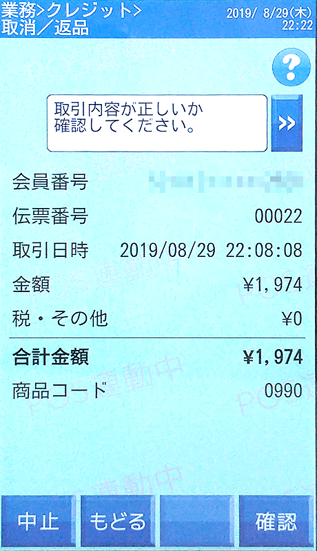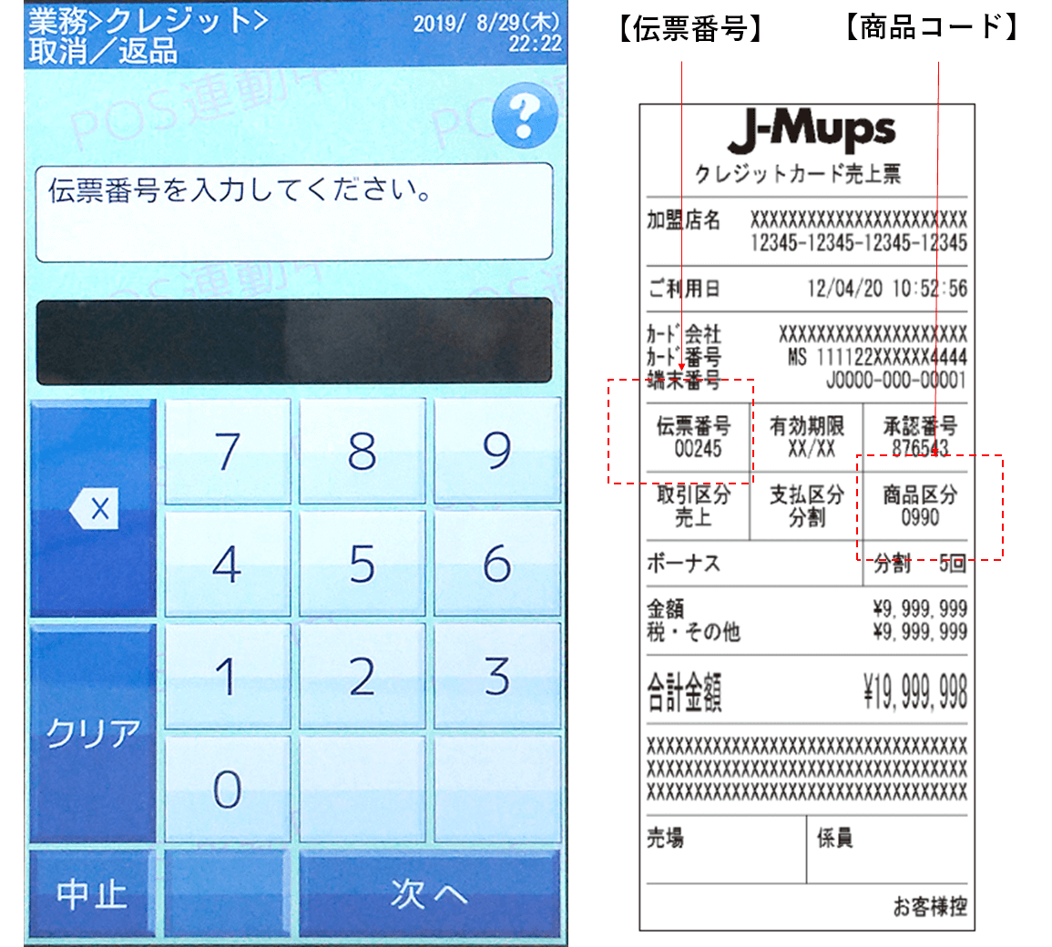 [10]「伝票番号を入力してください」と表示されます。 伝票番号を入力してください。 伝票サンプル参照 [11]カード会社により「商品コードを入力してください」と表示される場合があります。 商品コードを入力してください。(伝票サンプル参照) ※商品コード入力は、カード会社により表示されない場合があります。