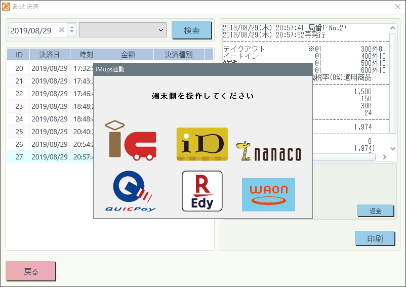 ここでは、あっと決済Windows 版( J-Mups )の電子マネー売上の返金登録の方法を案内します。 注意:電子マネーの場合、当日の直前取引だけ取り消しが可能です。直前取引より過去の取引に関しては、現金で返金を行ってください。