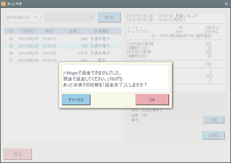 [9]直前取引より過去の返金処理は、電子マネーで返金できません。 返金ボタンを押したあとに、J-Mups よりエラー表示がされます。 その後、右図のような画面が表示されるので、 OK を押して、現金の返金処理をして下さい。
