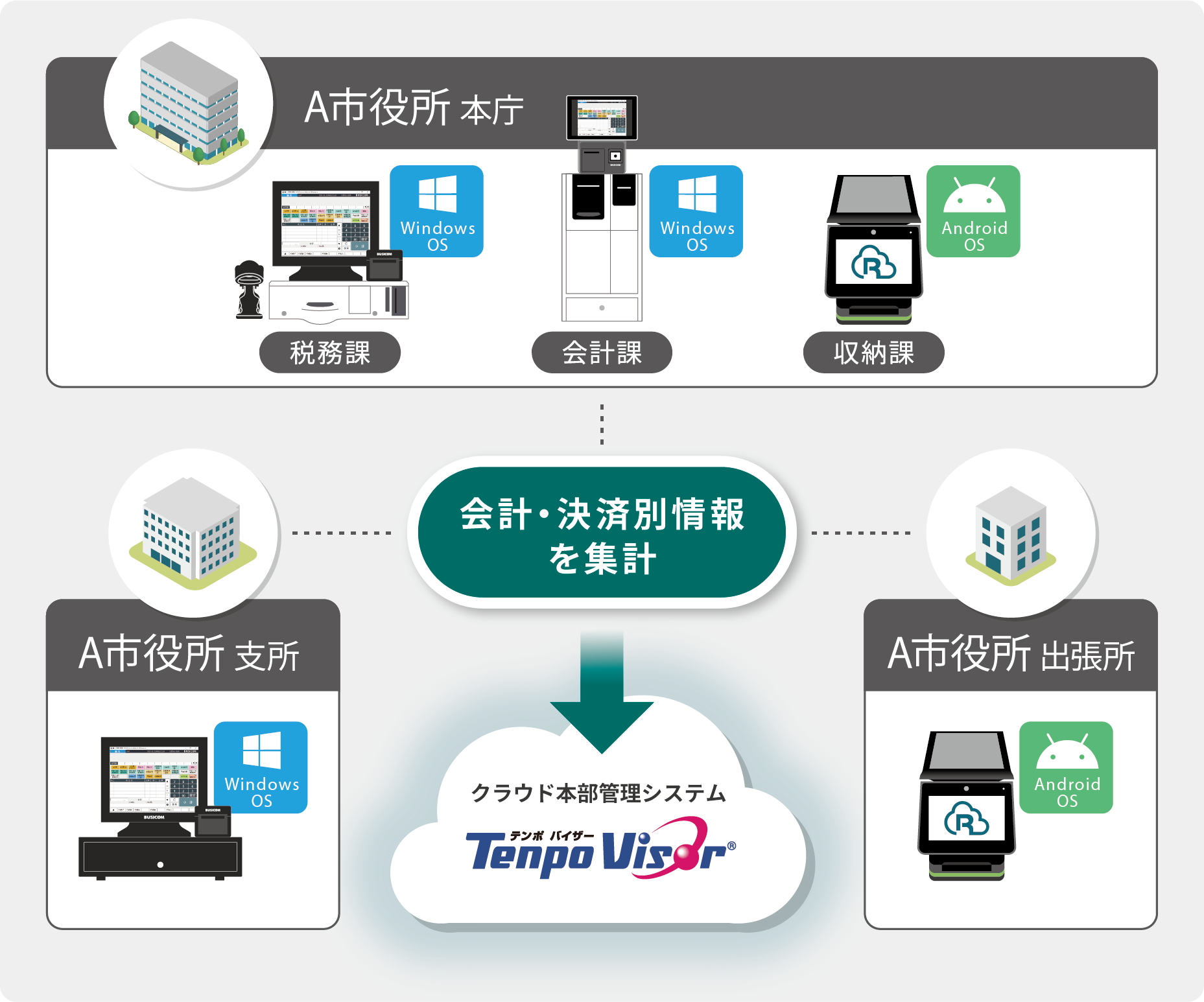 クラウド本部管理システム「TenpoVisor」で、POSレジの会計情報を収集し、一元的管理できます。