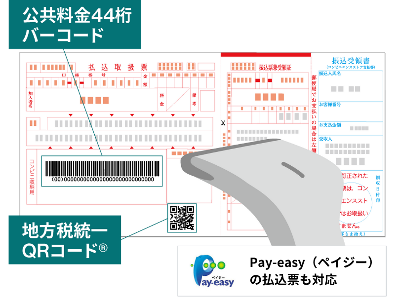 料金払込票に表示されている、GS1-128シンボルバーコード(44桁固定長)または、地方税統一QRコード(eL-QR)をスキャンして、金額を表示させることができます。