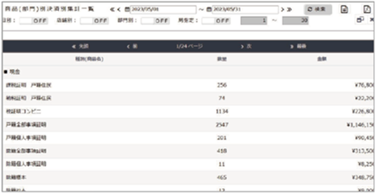 さらに、クラウド本部管理「TenpoVisor」(オプション)を使うことで「決済別売上集計」の確認ができます。日次・月次・年次の集計内容を、A4版のPDF出力とCSVダウンロードができます。