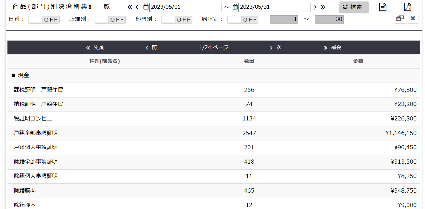 集計は日ごとに商品別、決済別の集計を確認することができます。