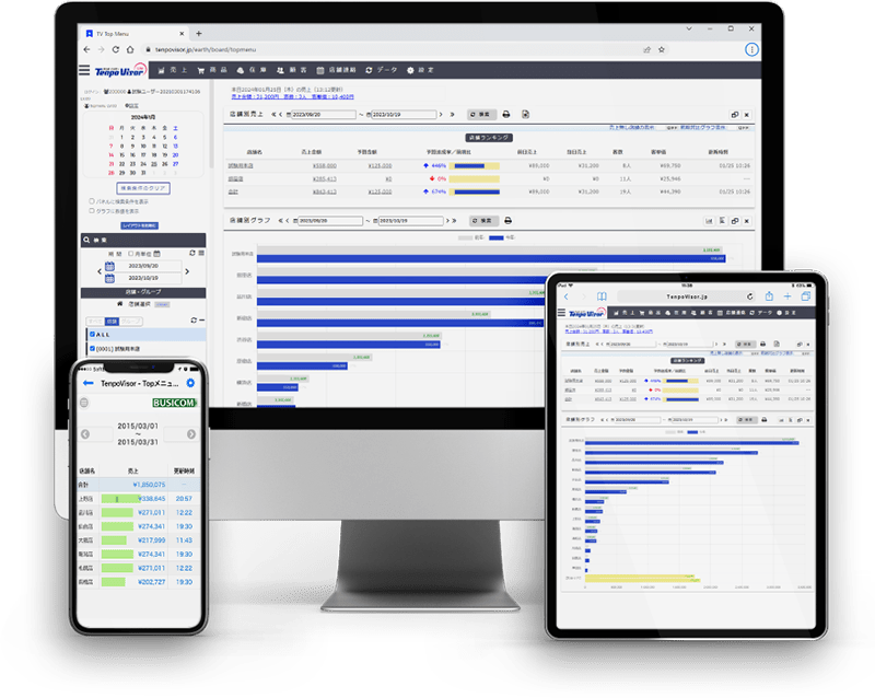 TenpoVisorはPOSレジの情報をインターネット経由で収集・集計するクラウド本部管理システムです。多彩なデータ集計が可能となり、簡単な操作で必要な時に知りたい情報を確認できるようになります。
