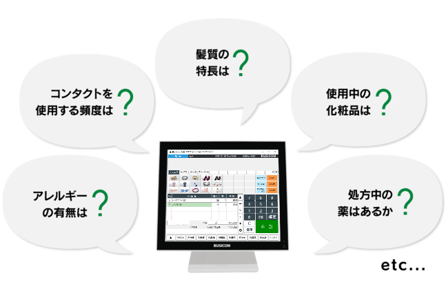 カルテにはお店に合わせた質問内容が設定できます。簡易質問のプルダウン式と、テキスト入力ができる入力式の両方が利用できます。アンケートなどお客様の回答をPOSに登録することで、購入履歴だけでなくカルテでの詳細情報もPOSレジで確認することができます。
