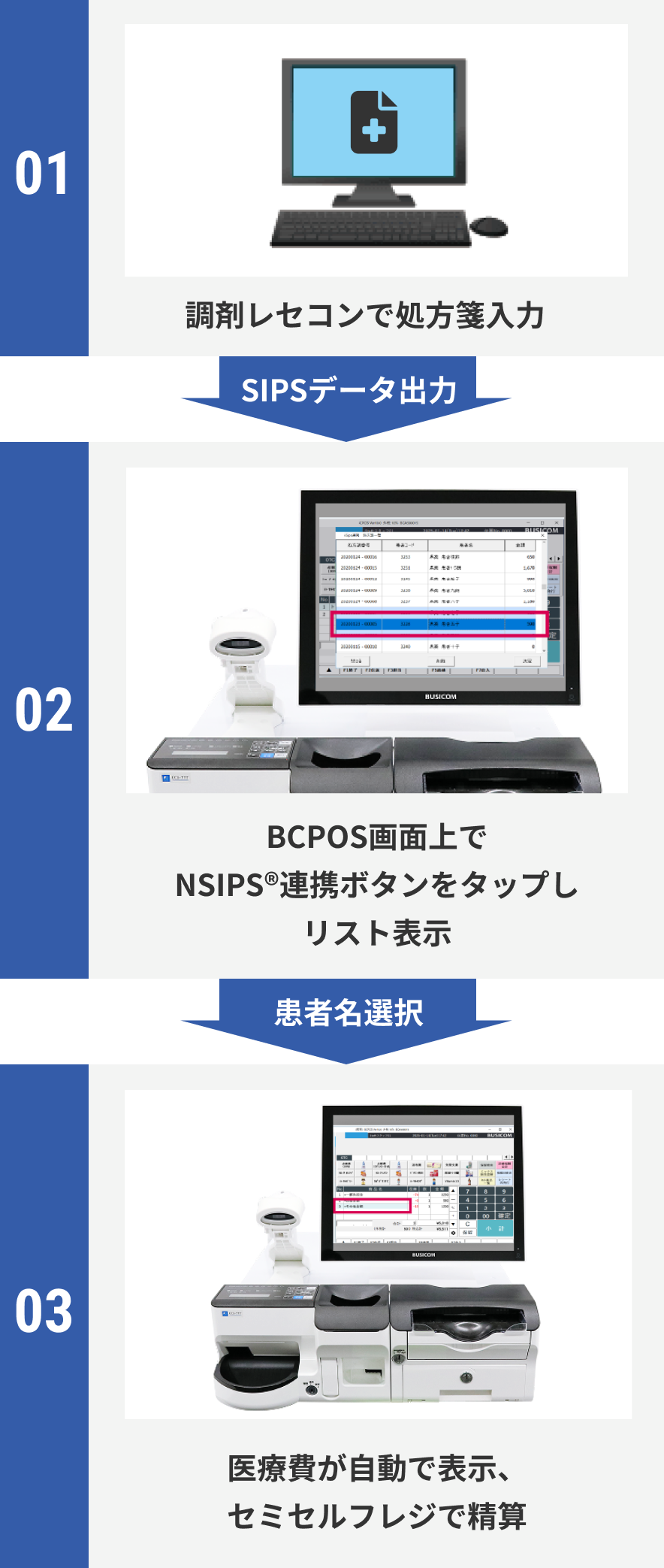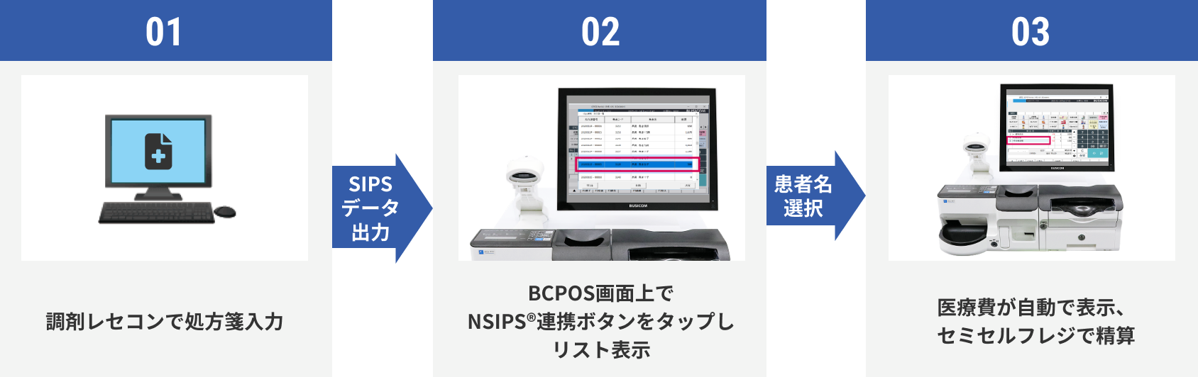 NSIPS®(調剤システム処方IF共有仕様)と調剤レセコンを連携させることでレセコンから出力された会計データは自動的にPOSレジへ取り込まれ、患者様の窓口会計を正確かつスムーズに処理できます。