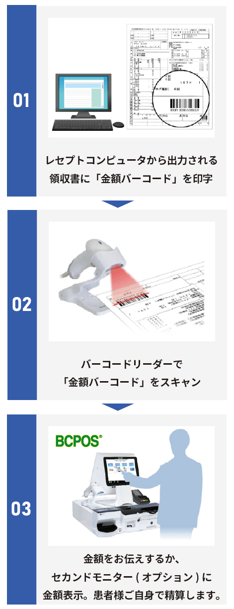 NSIPS®に対応したレセコンをご利用の調剤薬局様では、BCPOSから医療費領収書の発行が可能となり、窓口でのお薬お渡し後、患者様自身によるセルフ会計が実現します。これにより、会計待ちの解消やスタッフ業務の省力化・効率化を強力にサポートします。