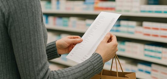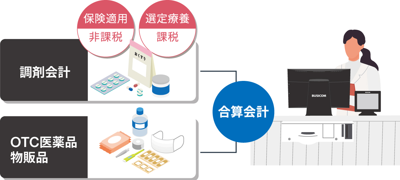 調剤会計とOTC医薬品/一般商品の金額を合算し、1回のレジ会計でまとめて精算できます。