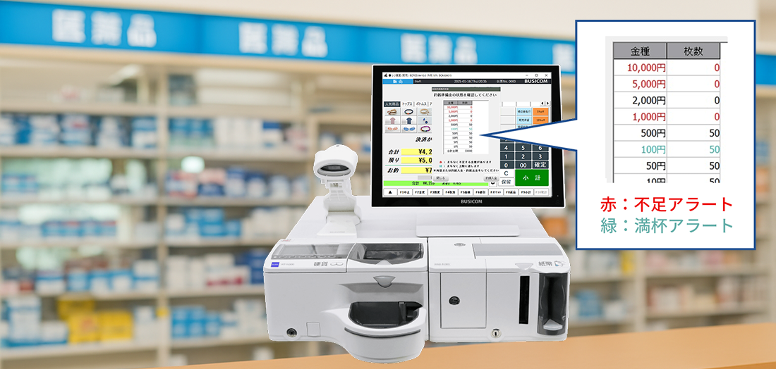 POSレジソフト「BCPOS」は釣銭金の不足や満杯が近づくとレジ画面にアラートが出るので、トラブルを未然に防ぎます。