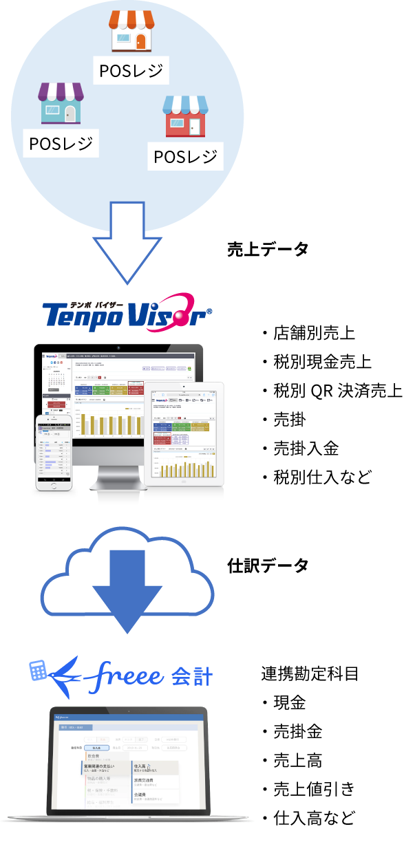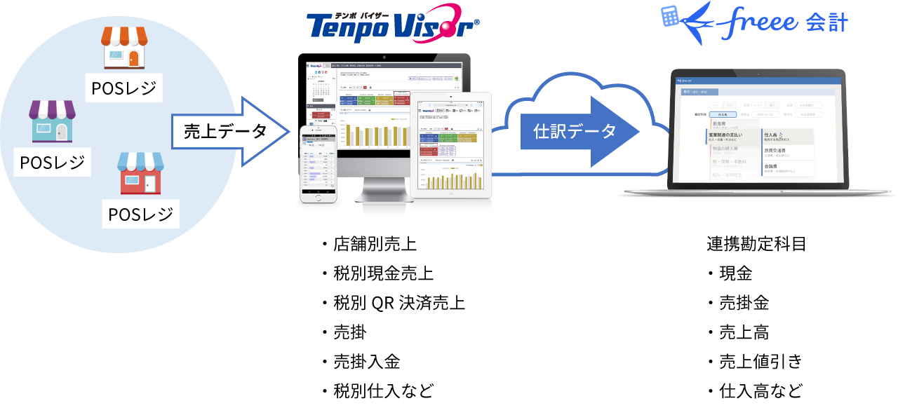 TenpoVisorに収集されたPOSデータは、会計データとして1日1回freee会計に自動でデータ連携します。