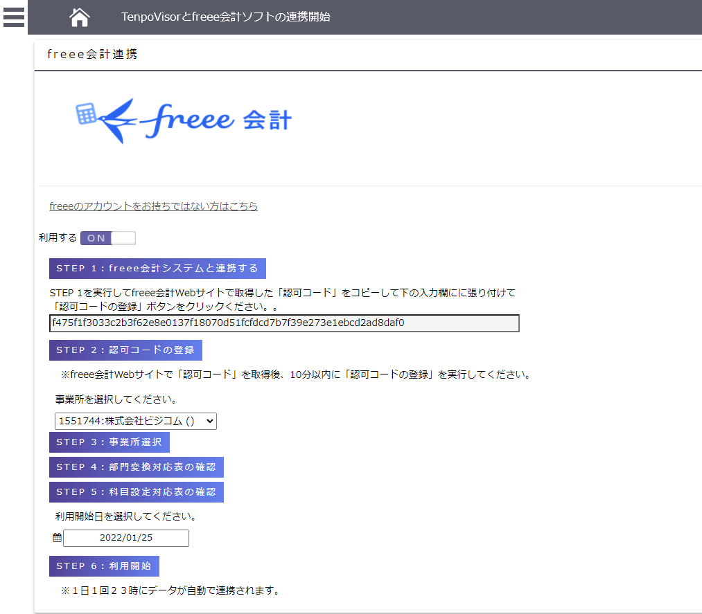 TenpoVisorにログイン後、「TenpoVisorとfreee会計ソフトの連携開始」ページから手続きを行います。