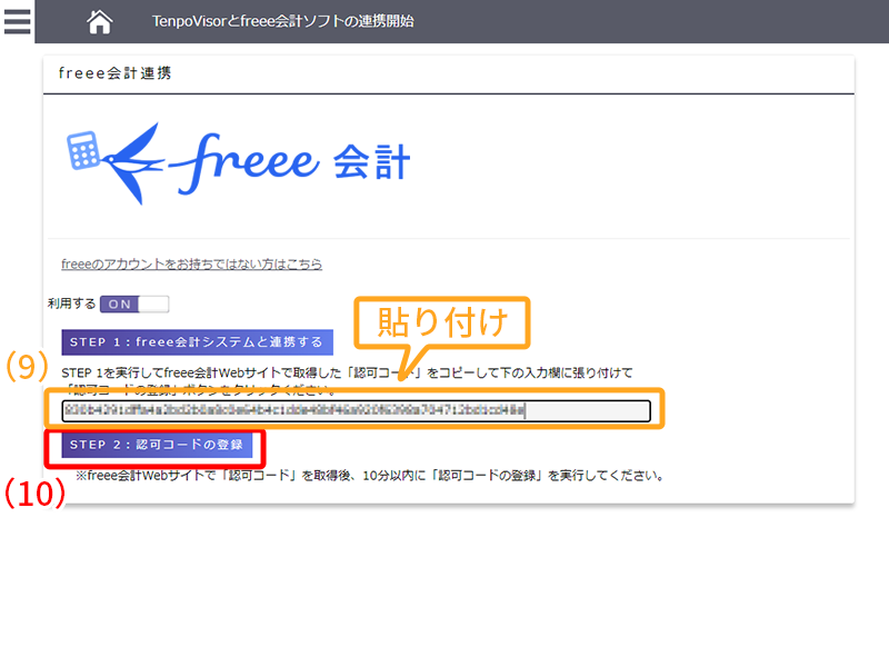 TenpoVisorとfreee会計ソフトの連携開始のタブに戻り「許可コード」を貼り付けしてください。