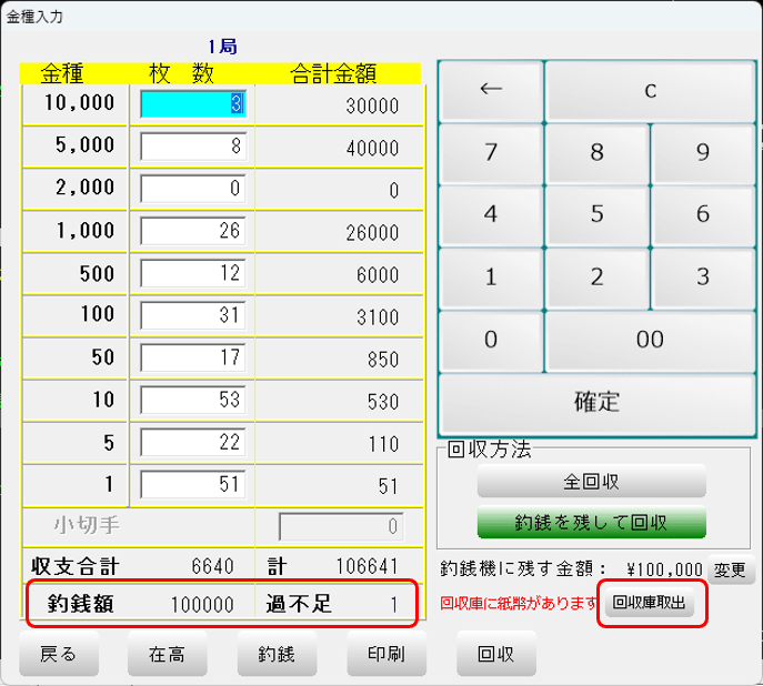 - 自動釣銭機ご利用時、設定した枚数になった際に表示するアラート画面において、上限の色を緑色に変更します。